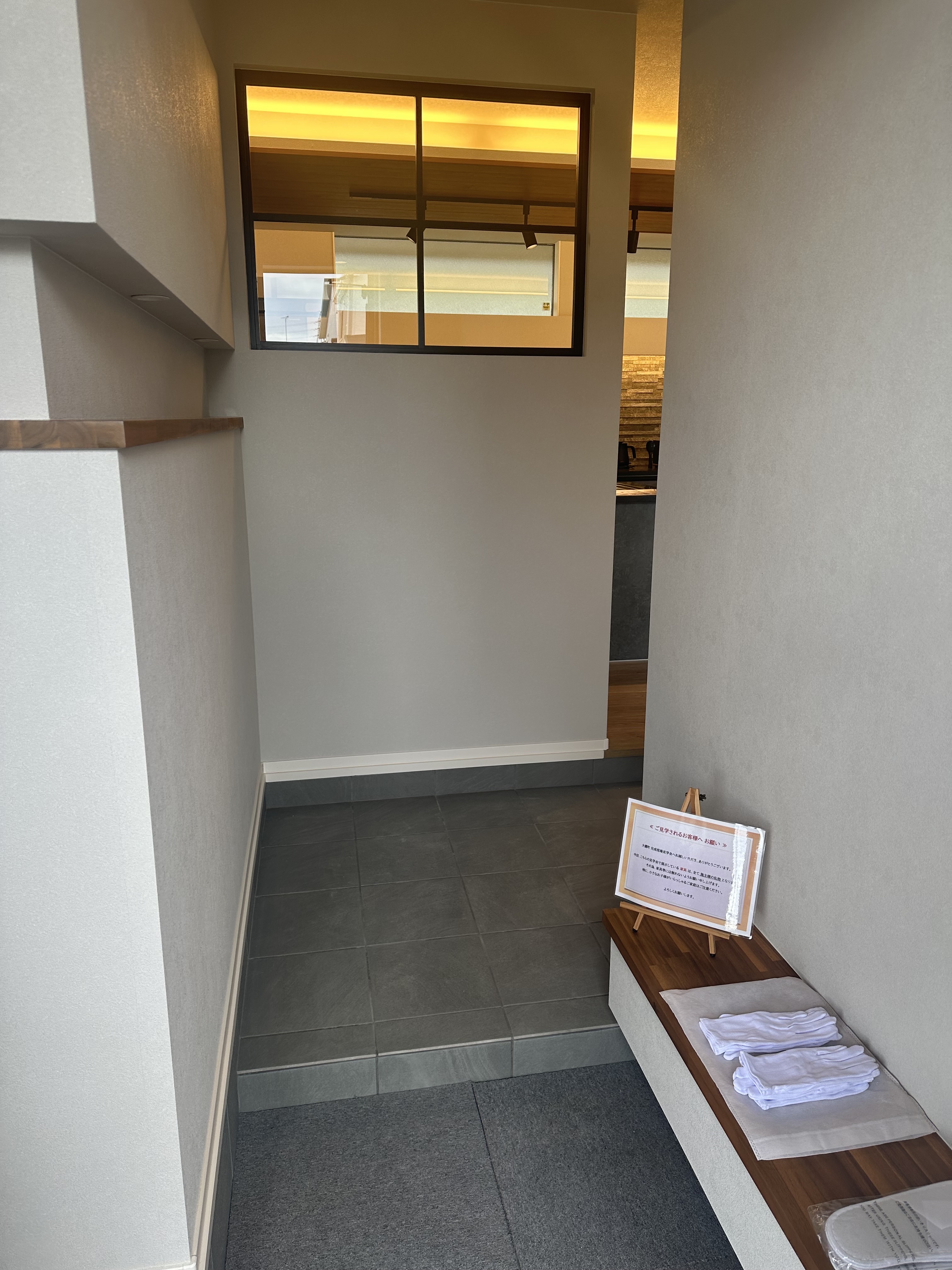 ②玄関にはこだわりのニッチに装飾室内窓を合わせてオシャレな空間を演出