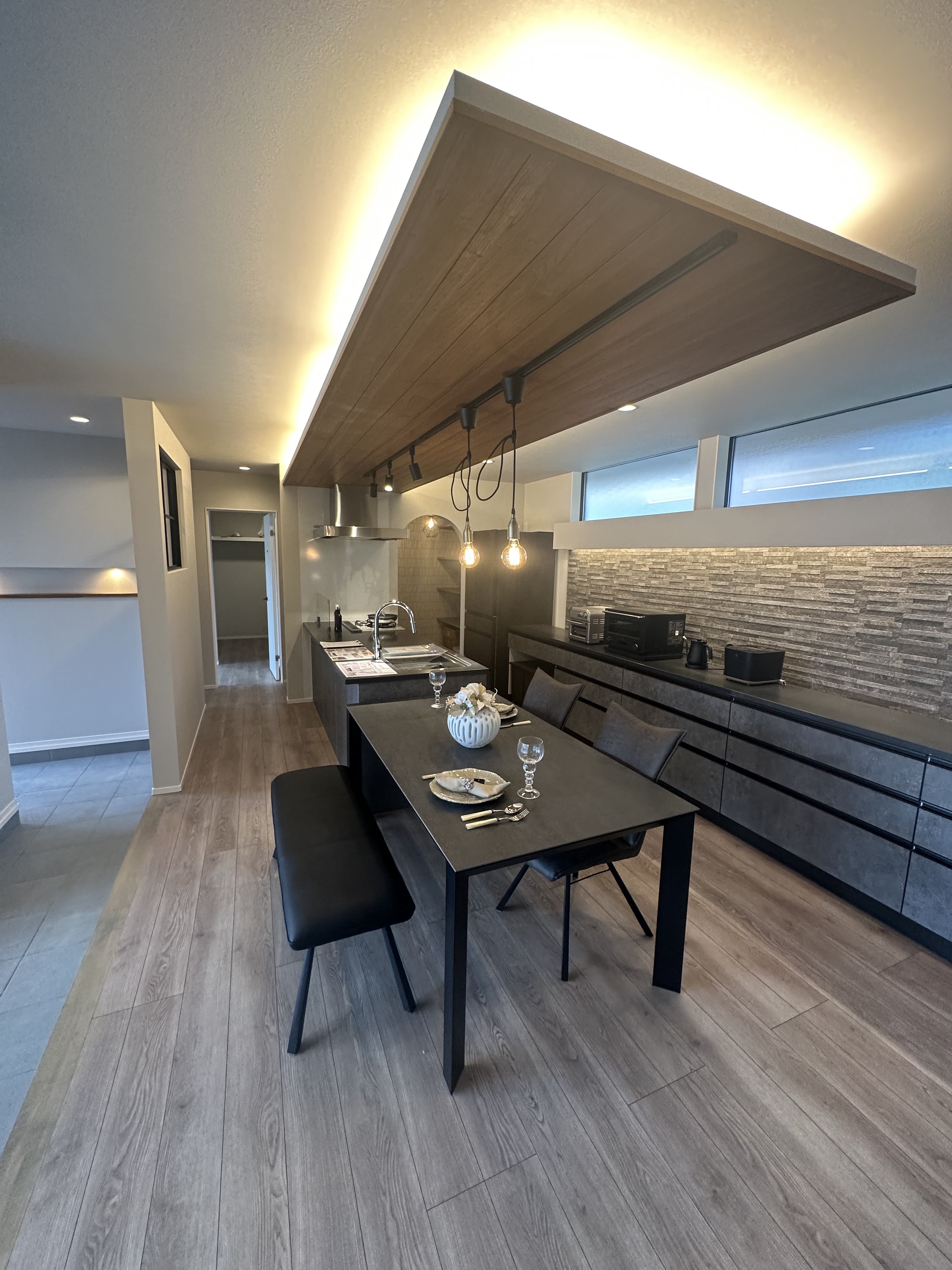 ③キッチンはアイランドタイプ、折下天井を木目で仕上げ間接照明を設置