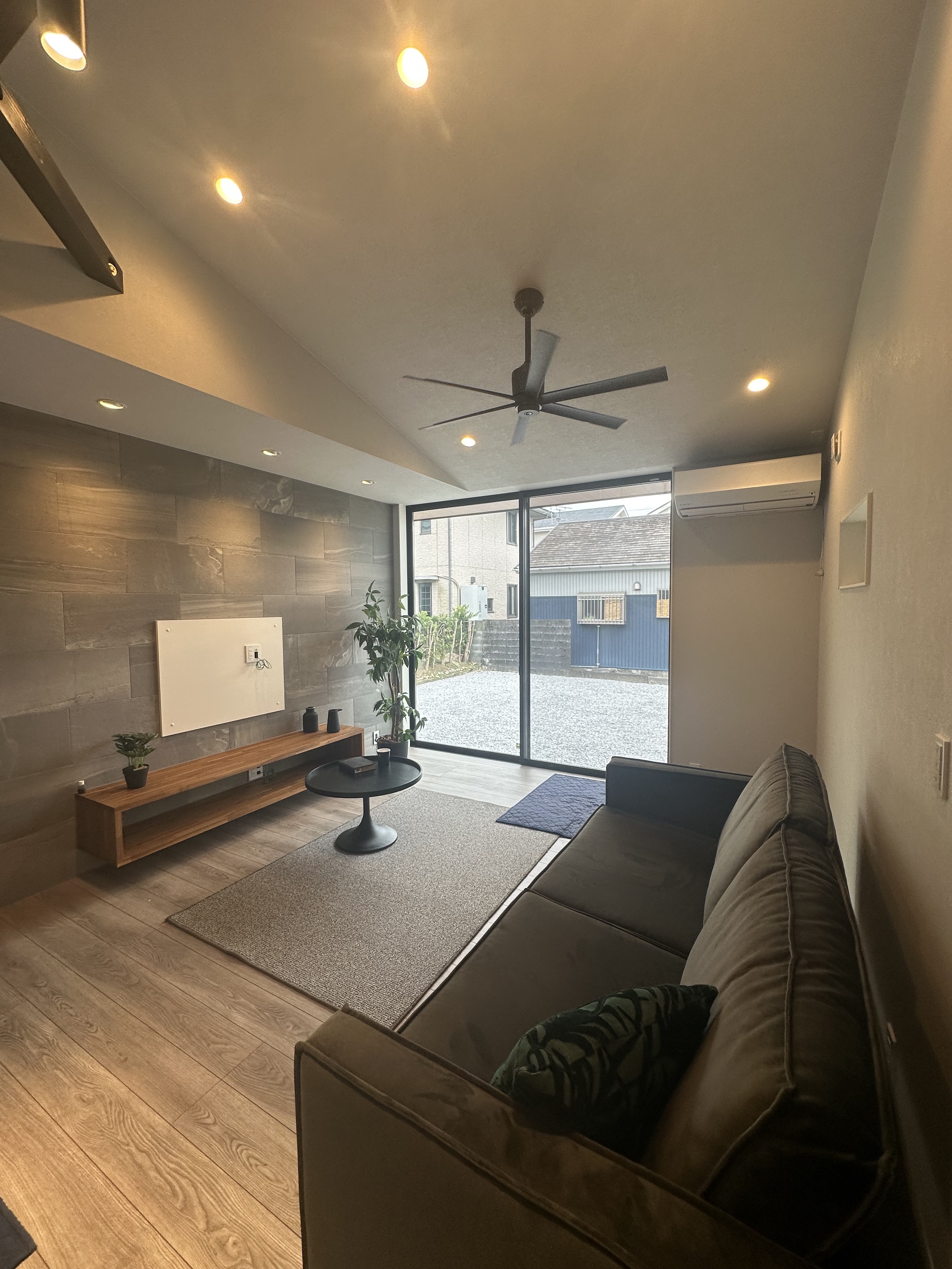 ④リビングは装飾壁に勾配天井を合わせ開放的な空間に